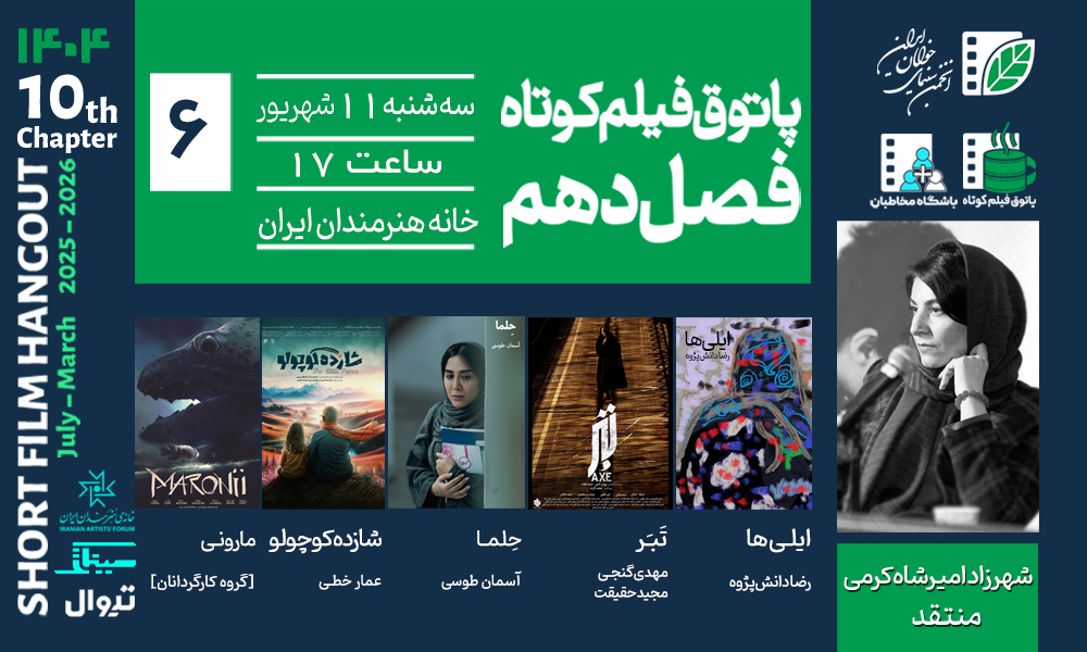 ششمین جلسه از فصل دهم پاتوق فیلم کوتاه سهشنبه ۱۱ شهریور ۱۴۰۴ ساعت ۱۷ در سالن استاد ناصری خانه هنرمندان ایران برگزار میشود.
