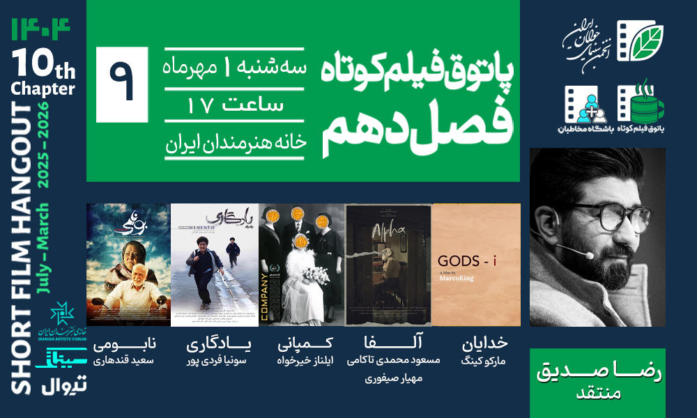 جلسه نهم فصل دهم پاتوق فیلم کوتاه ساعت ۱۷ روز سهشنبه ۱ مهر ۱۴۰۴ در سالن استاد ناصری خانه هنرمندان ایران برگزار میشود.