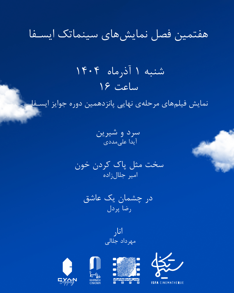 سلسله نمایشهای سینماتک ایسفا تا آخر اسفندماه روزهای شنبه هر هفته در خانه سینما برگزار میشود.